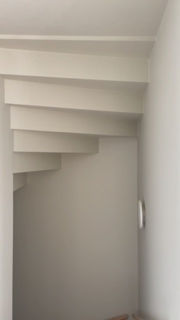 Den stedbygde innvendige trappen ser nærmest ut til å være brettet i papir der den snor seg opp uten synlige vanger.