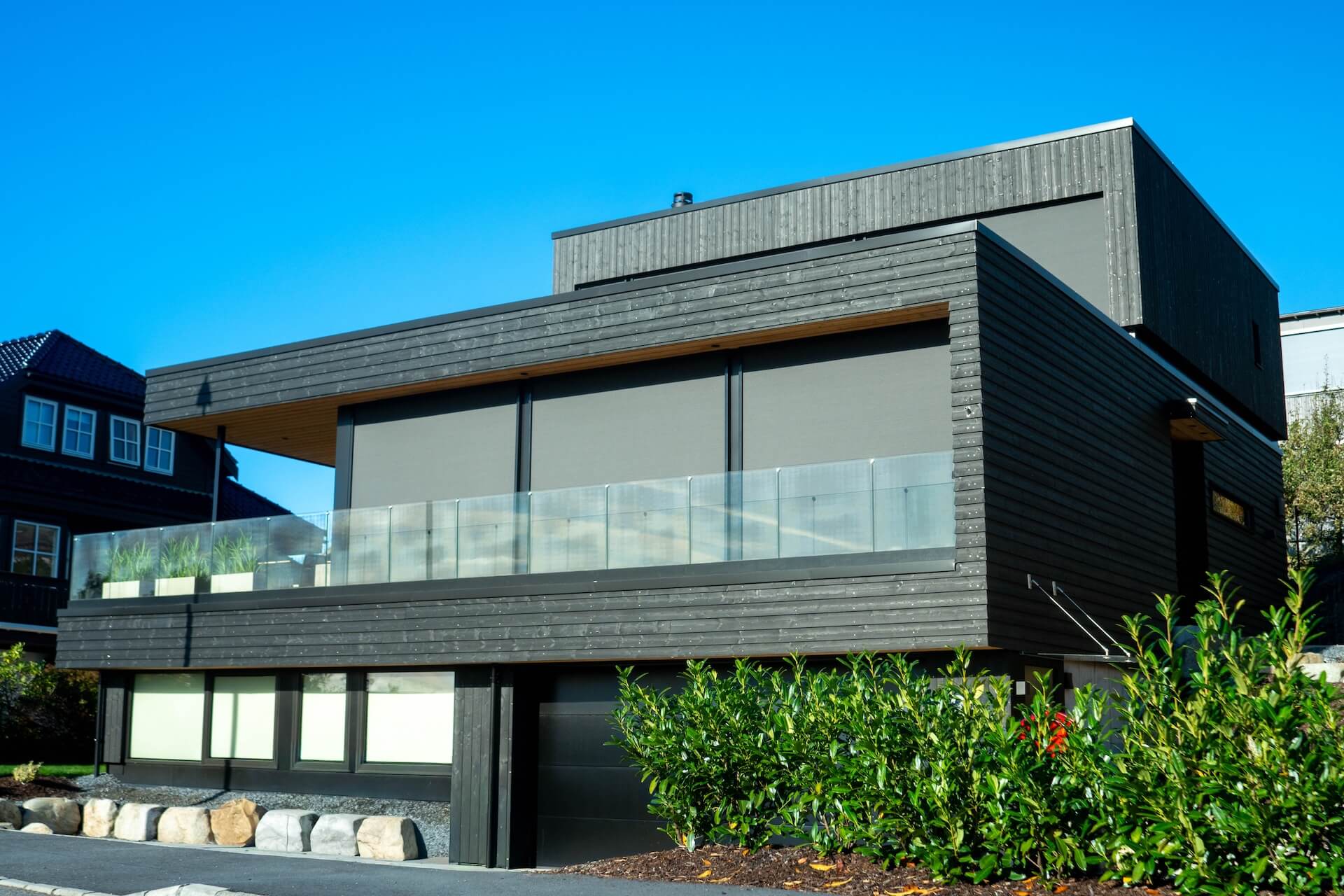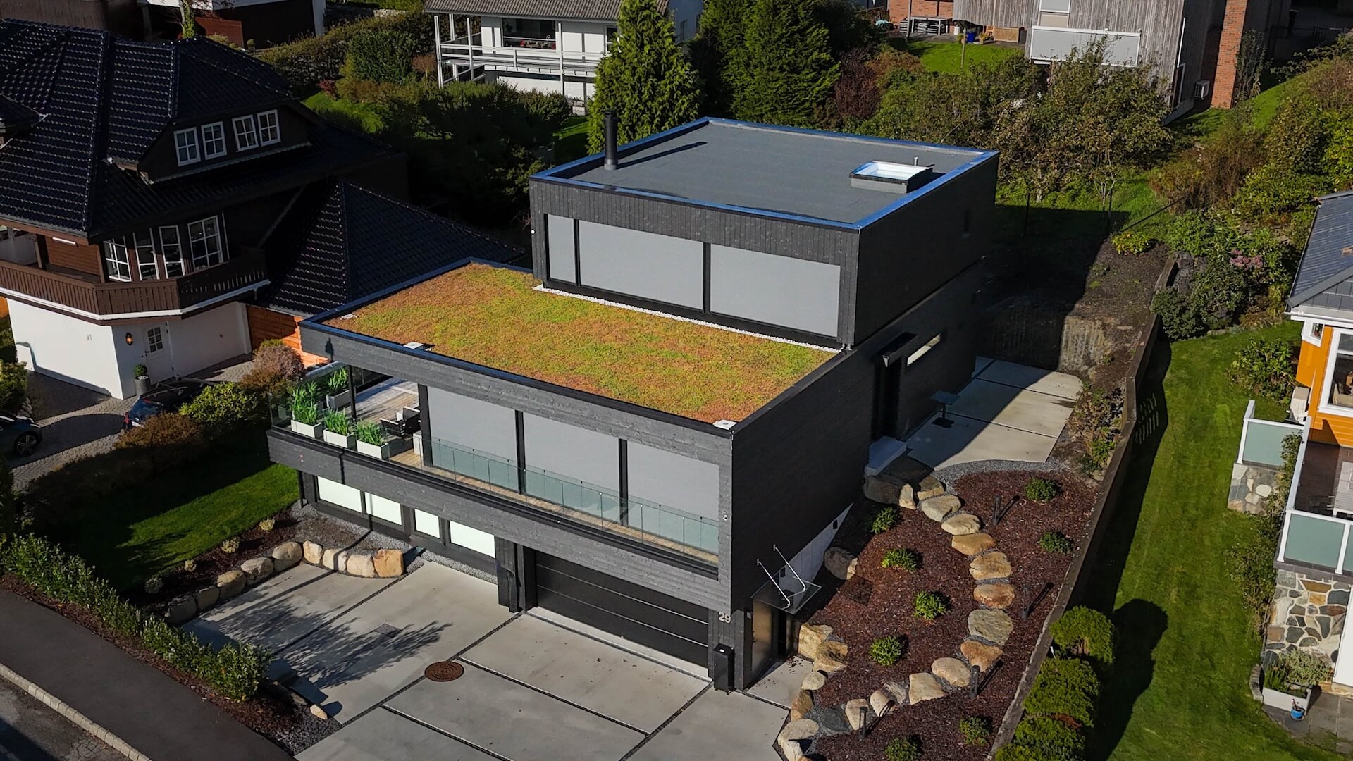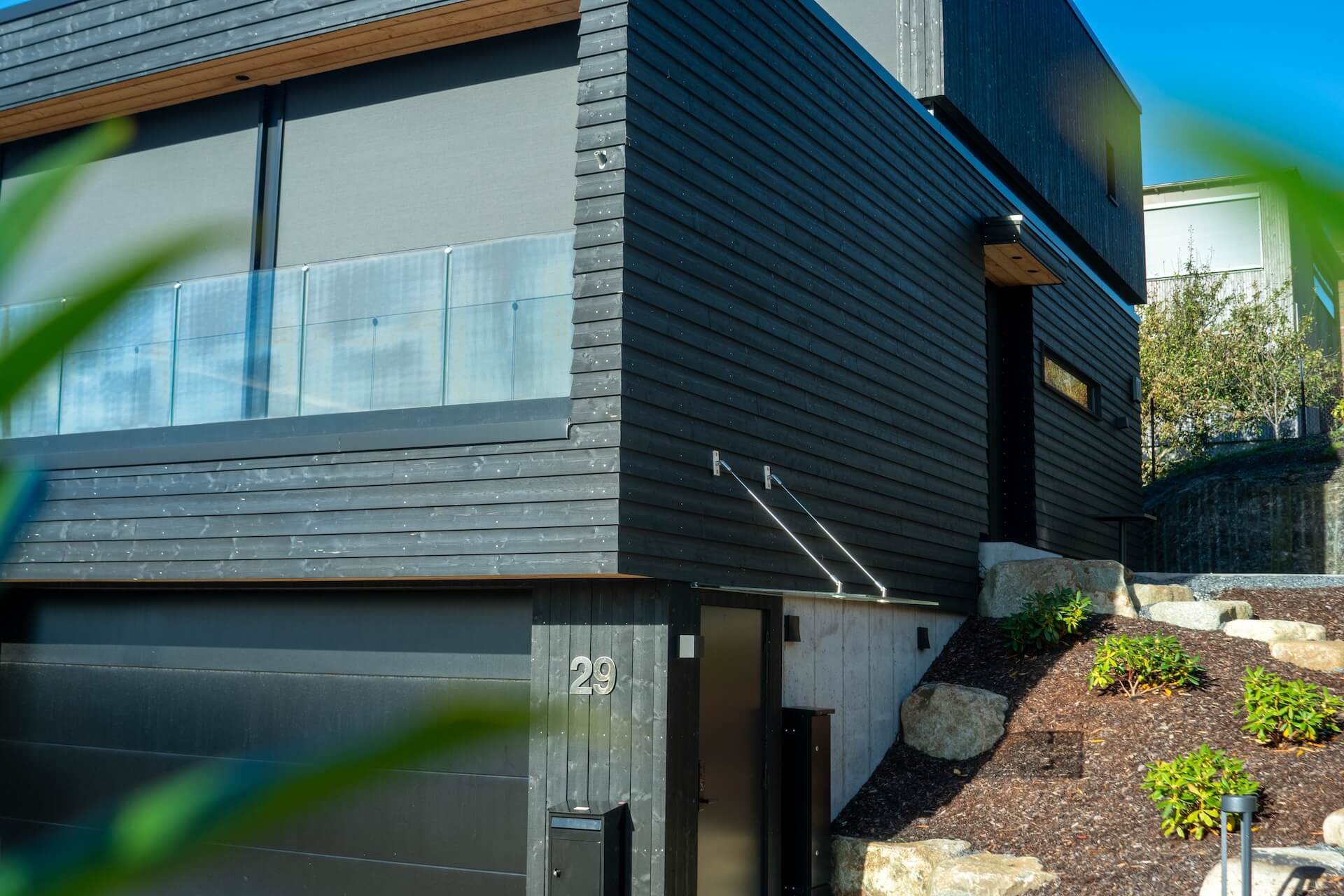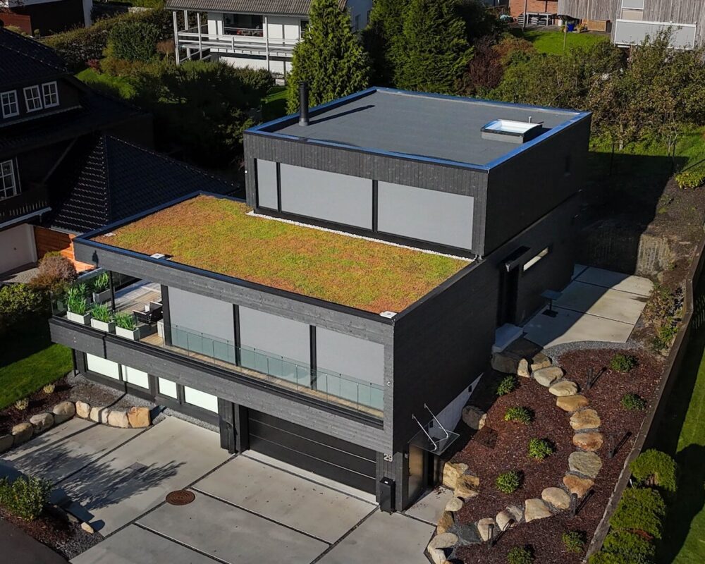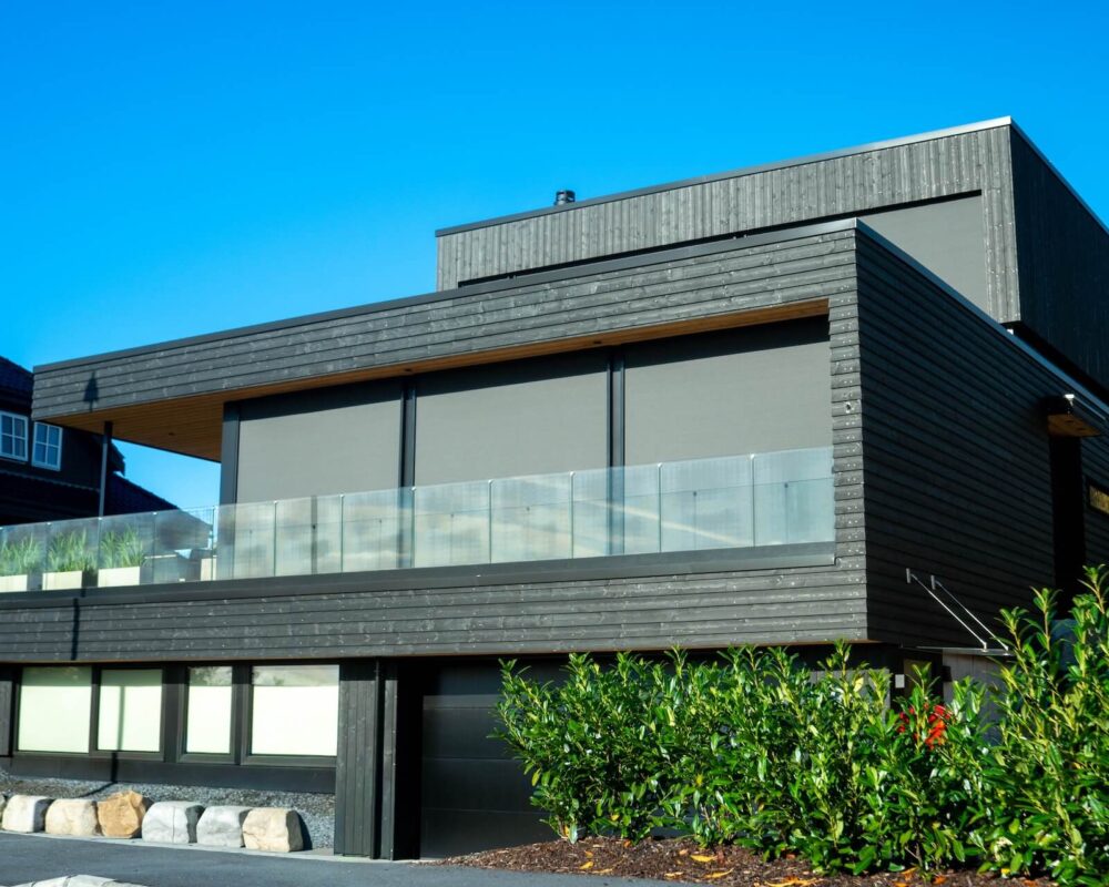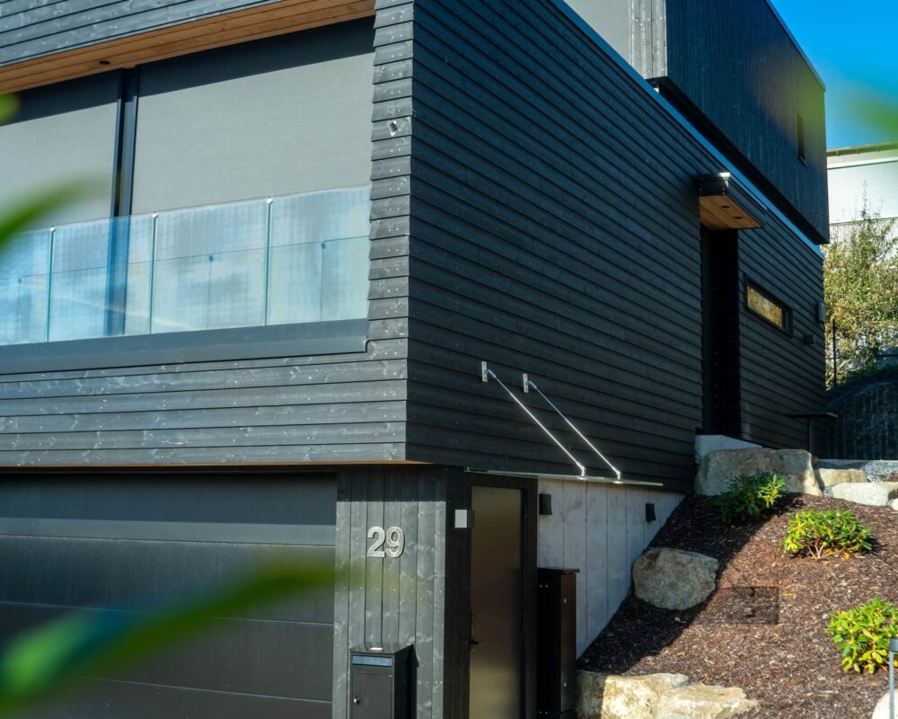 I en sørvestvendt åsside på Hinna i Stavanger har vi ført opp denne kjekke saken for Sissel og Knut. Arkitekt Petter Aase har på en mesterlig måte fått til et balansert uttrykk ved å la klassiske strenge linjer fått spille på lag med organiske former og materialer. Boligens øvre plan har et underliggende relieff som får volumet til å fremstå som en gigantisk dreibar rubiks kube.