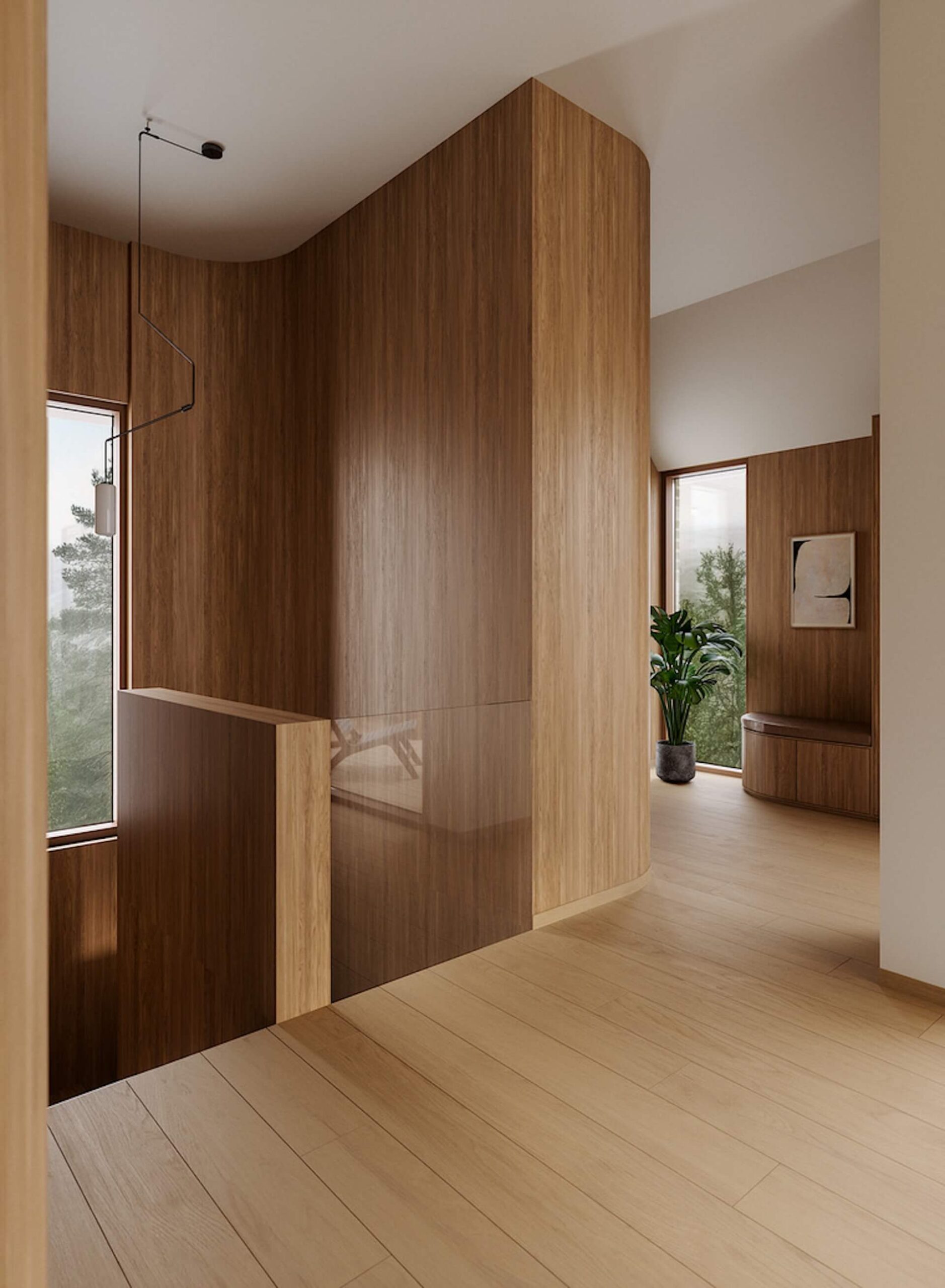 Bi-inngang blottet for teknisk utstyr, med direkte tilkomst fra lukket garasje sørger for optimal flyt i hverdagen. Alt tøy ryddig organisert og lett tilgjengelig.