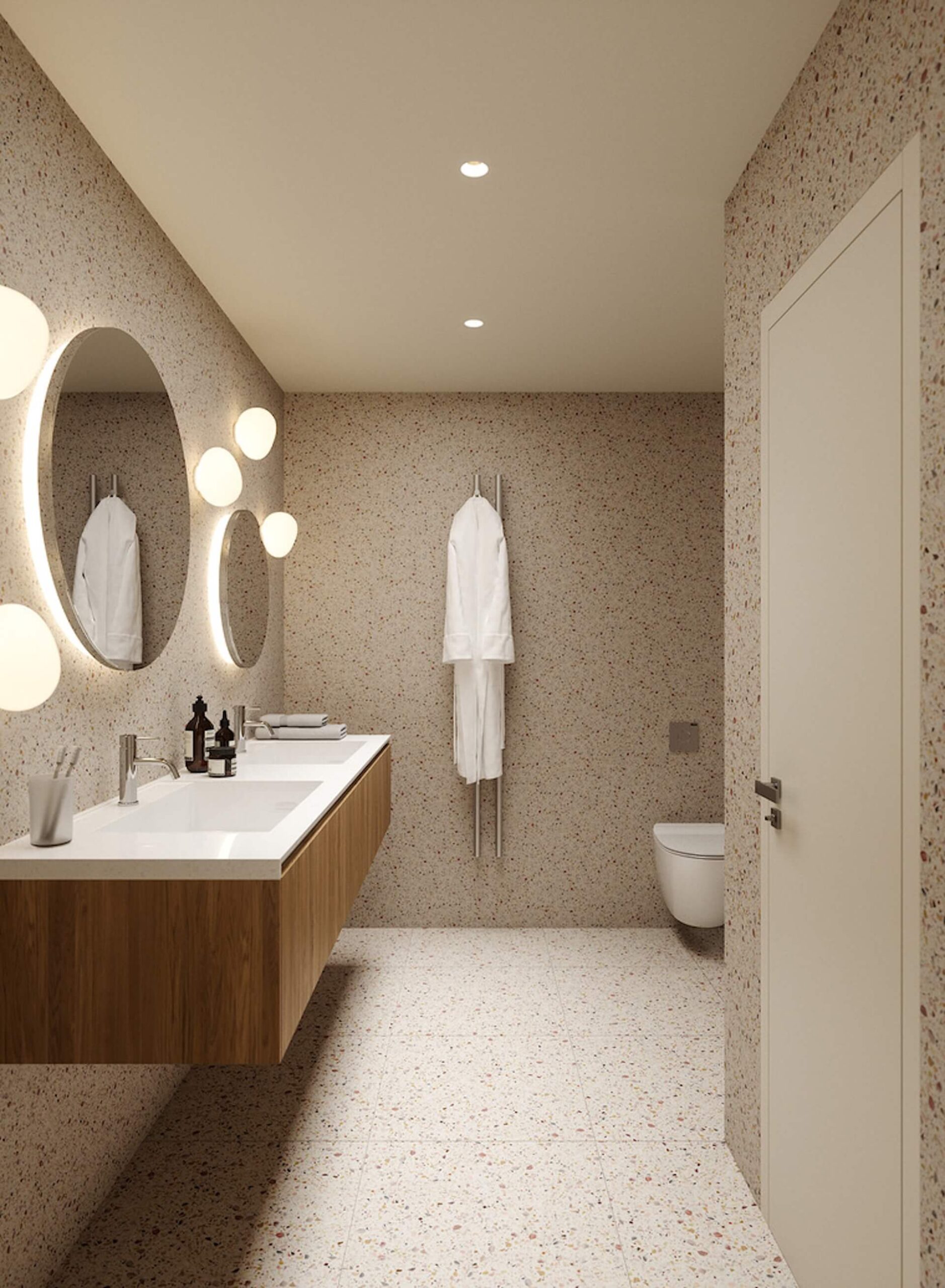 Fliser i 60x60-format på utvalgte vegger på bad samt mosaikk i dusj. Gulvvarme på gulv i samtlige våtrom for ekstra komfort.
