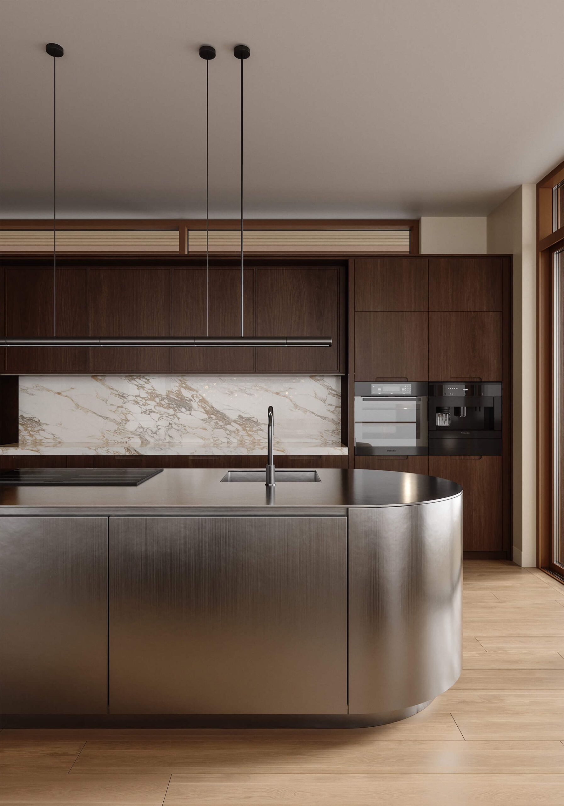 Kortreist og lekkert kjøkken fra Bjerks Trevarefabrikk på Austrått leveres med integrerte hvitevarer og Silestone benkeplater.